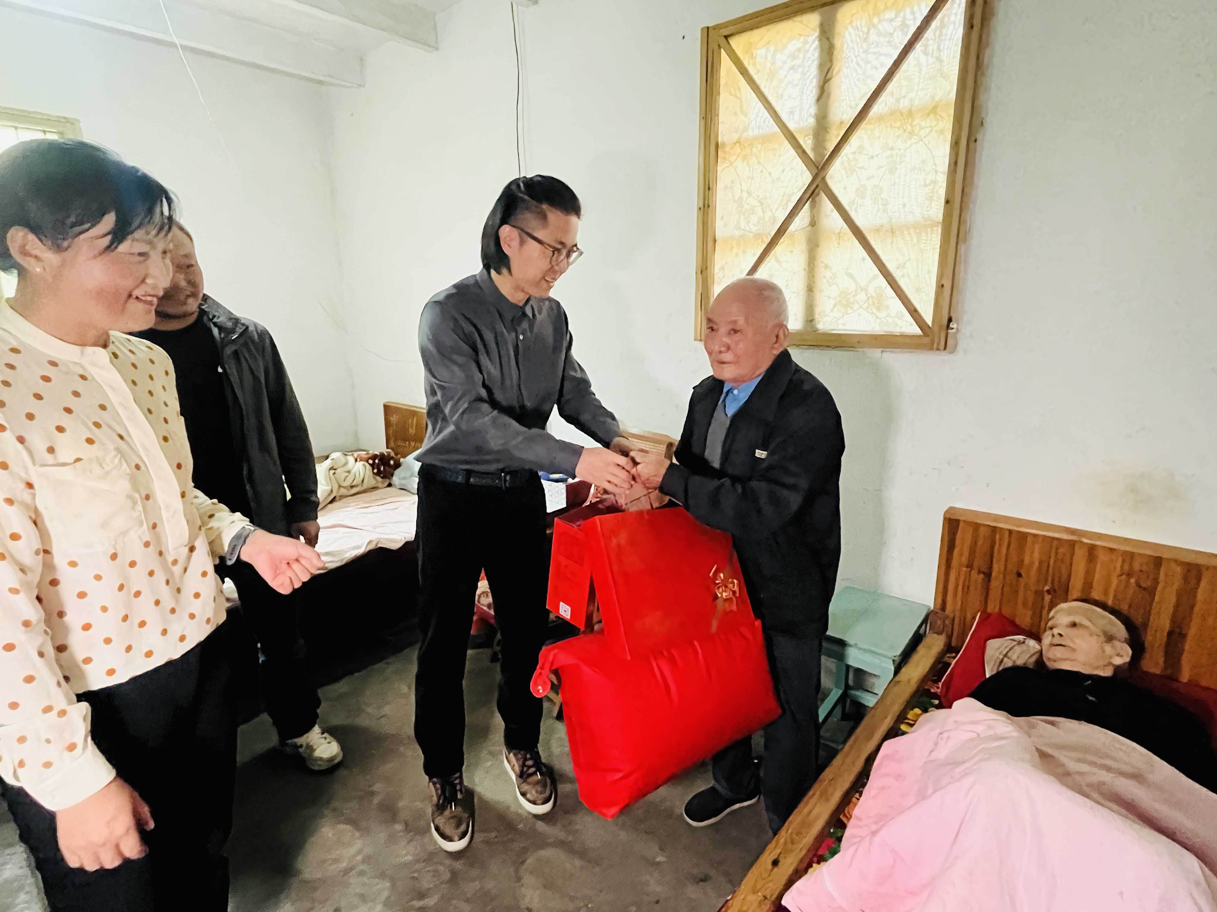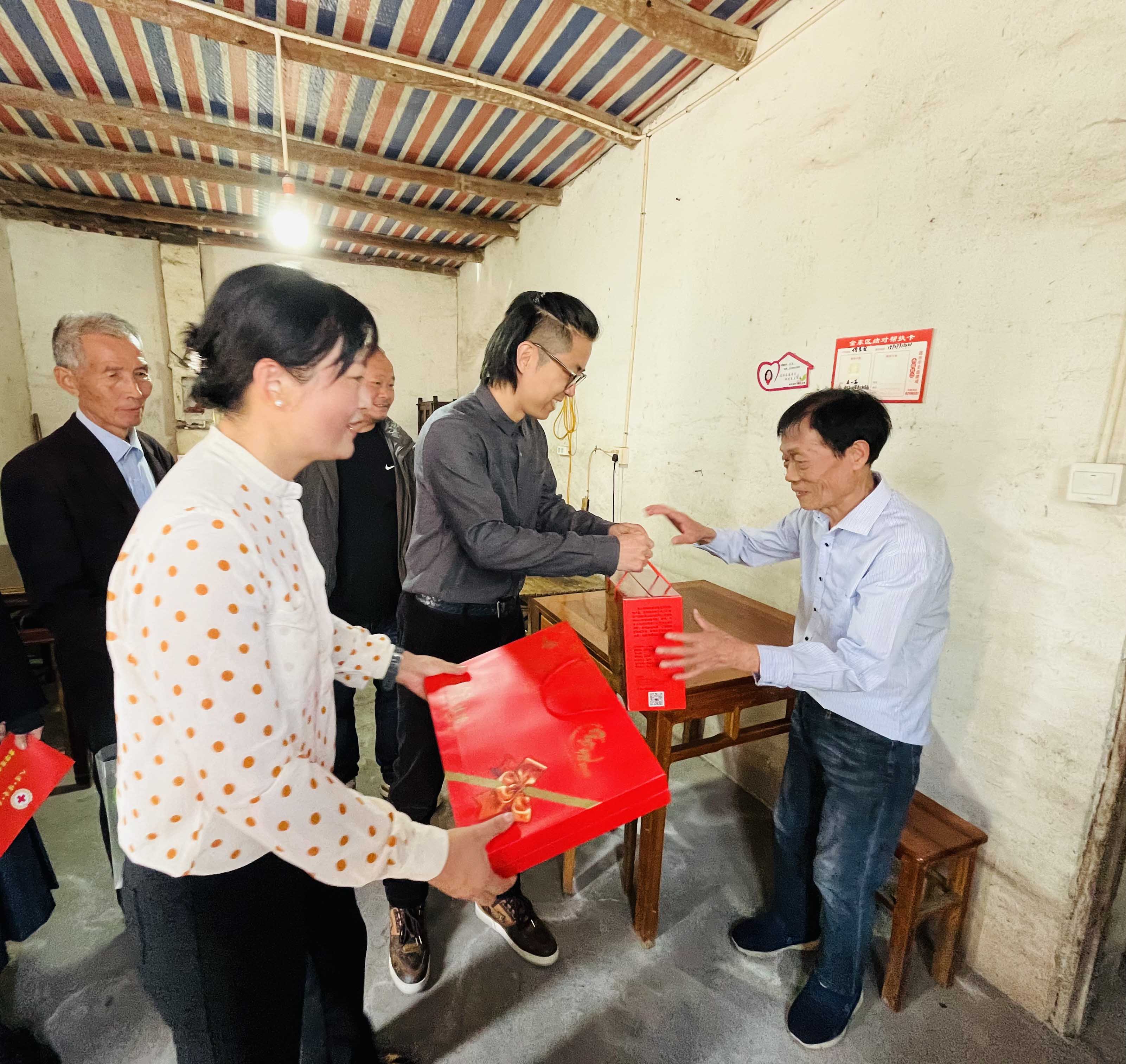 “重陽節(jié)快樂,祝你們健康長壽!”在村領(lǐng)導(dǎo)的陪同下,蔣晨虹董事長、傅融總裁一行走訪了村里的困難家庭,為他們送上慰問金及食物、被子、洗浴用品等生活物資,并與他們親切交談,關(guān)心詢問他們的身體狀況和生活情況。這不僅讓困難家庭感受到了社會的溫暖和關(guān)懷,也進(jìn)一步體現(xiàn)了金廈對弱勢群體的關(guān)注和支持。